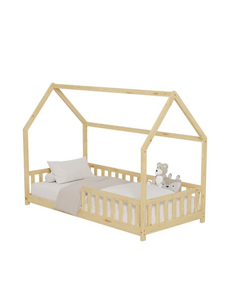 Παιδικό κρεβάτι PHYLLIS τύπου Montessori. Έχει σχεδιαστεί σύμφωνα με το εκπαιδευτικό σύστημα Montessori, σύμφωνα με το οποίο τα παιδιά μαθαίνουν καλύτερα, όταν επιλέγουν μόνα τους τι θα κάνουν. Το χαμηλό ύψος κρεβατιού χωρίς πόδια, βοηθά να εξερευνούν την αυτονομία τους και να ανεβοκατεβαίνουν από το κρεβάτι τους ελεύθερα ανά πάσα στιγμή. Είναι σε διάσταση για μονό στρώμα 90x190 εκ, και αποτελεί μια άριστης ποιότητας, μοντέρνα και ασφαλή επιλογή για το παιδικό δωμάτιο μιας και διαθέτει ξύλινο κάγκελο περιμετρικά. Είναι ξύλινο σε ΦΥΣΙΚΟ χρώμα βαμμένο με αβλαβές βερνίκι με βάση το νερό και μη τοξικό, ιδανικό για παιδιά. Το στρώμα τοποθετείται σε τάβλες κατασκευασμένες από ξυλεία κόντρα πλακέ. Ολόκληρο το κρεβάτι έχει σχήμα σπιτιού και μάλιστα αρκετά ψηλό, που θα δώσει μια ευχάριστη, «ζεστή», και παιχνιδιάρικη όψη σε κάθε παιδικό δωμάτιο.